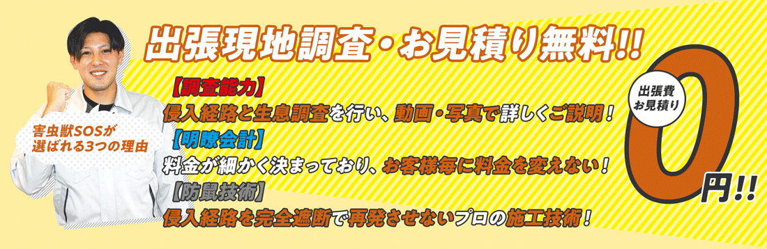 池谷さんという方が来られ、家の外と中を調査していただき、ねずみの通った形跡や侵入する出入口・糞等を見つけてわかりやすく説明とお見積りをいただきましたが、相場がわからないので、保留にしていただき、他の業者からも調査とお見積りを取ったのですが、最終的に害虫獣SOSさんにお願い致しました。