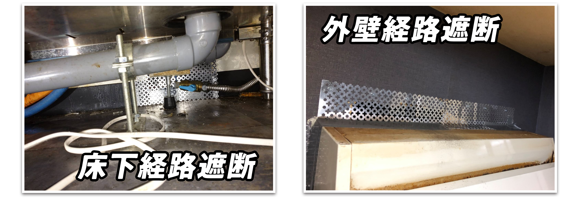 施工内容:2回施工プラン 煙霧追い出し・侵入経路対策 外部5箇所、内部2箇所・トラッピング・イエダニ駆除、消毒