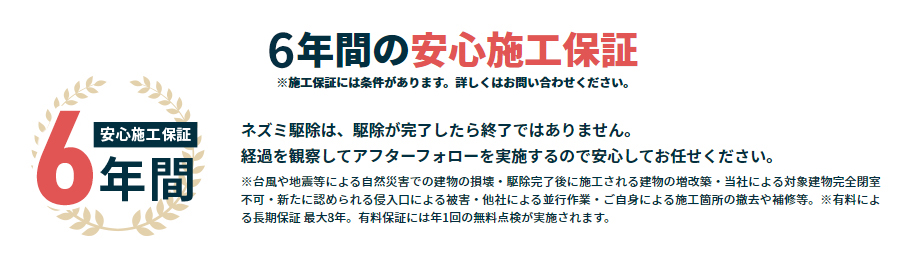 ※台風や地震・雪や雹等の自然災害での建物の破損や駆除完了後に施工される増築やリフォーム等、当社による対象物件完全閉室不可・閉室箇所の削害・新たに認められる侵入経路による被害・他社による並行作業・ご自身による施工箇所の撤去や補修等は、保証対象外となります。